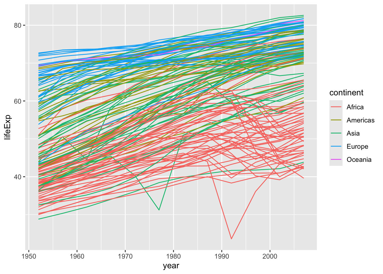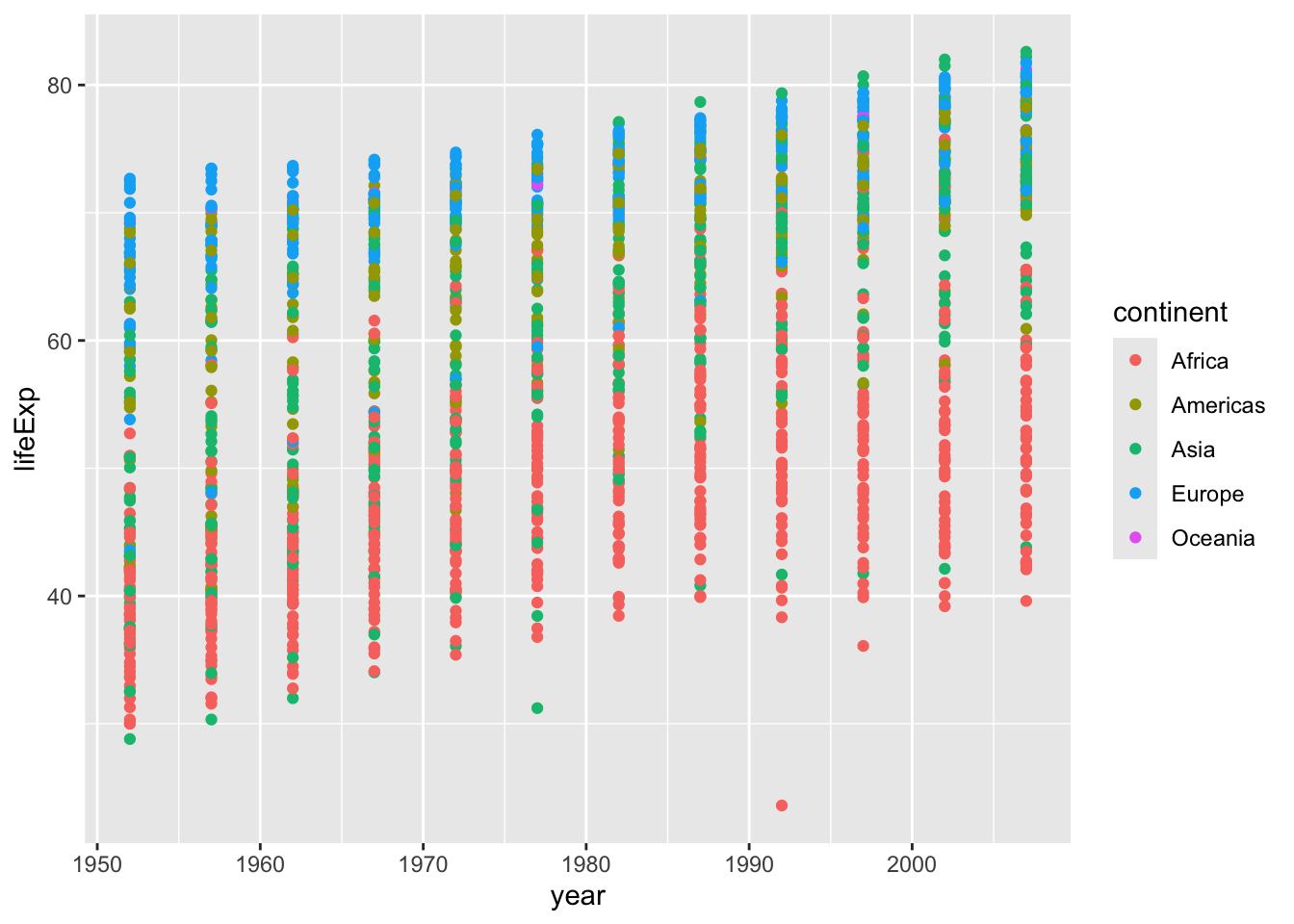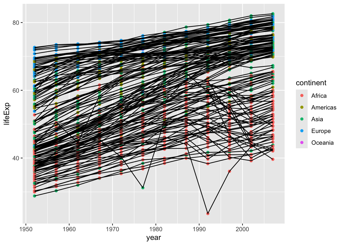 Note the plot looks a little weird since each point is a country, so for every year, we have an average life expectancy for each country.