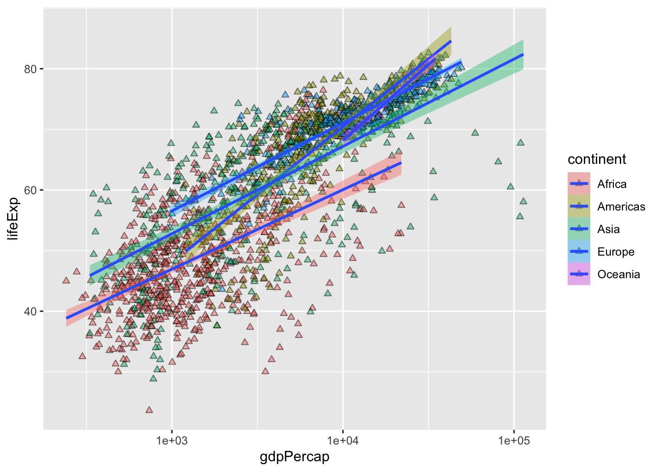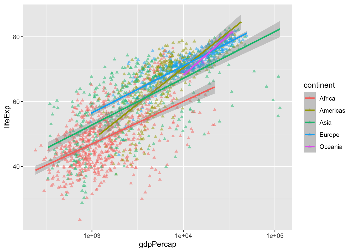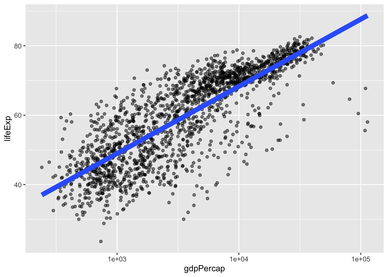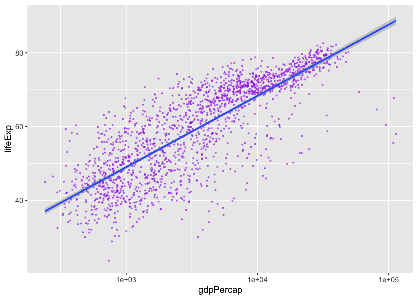 The presence of some outliers for gdpPercap make it hard to see this relationship. We can try log base 10 transforming the x-axis to see if this helps using a scale_*() function.