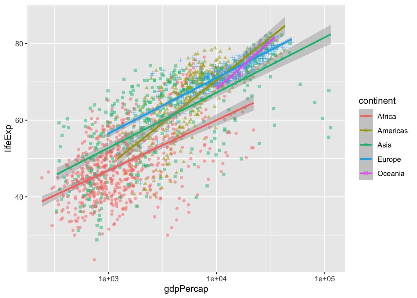 geom_point(aes(shape = continent), alpha = 0.5) +