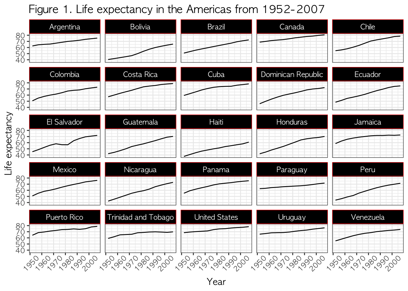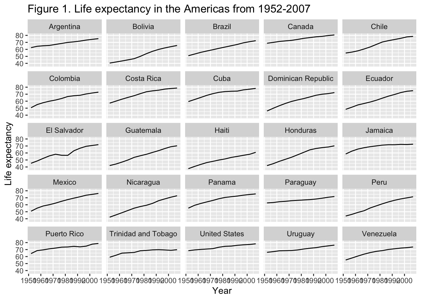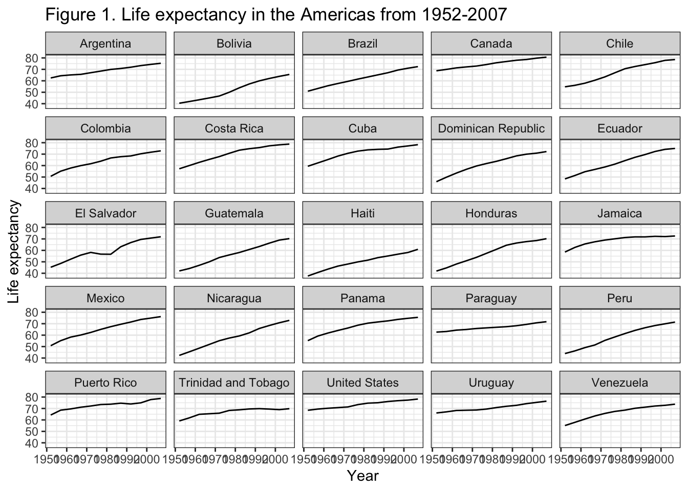 title = "Figure 1. Life expectancy in the Americas from 1952-2007", # main title of figure