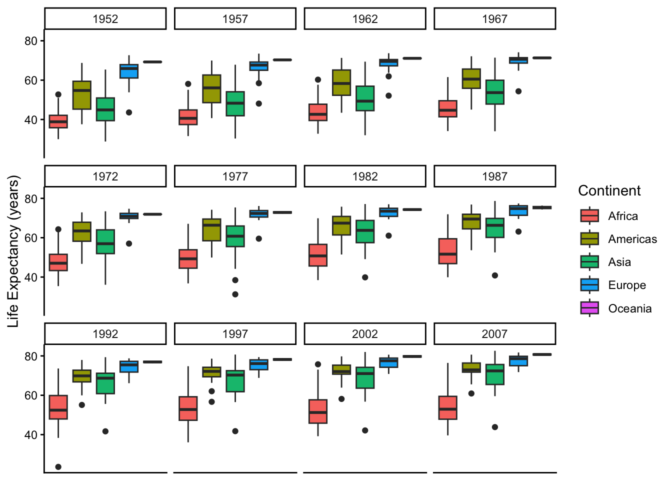 Create some box plots that compare life expectancy between the continents over the time period provided. Try and make your plot look nice, add labels and adjust the theme!