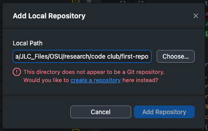 When we go to do this, we see that GitHub desktop is telling us that this directory does not appear to be a Git repository. We can click âcreate a repositoryâ to initiate version control on this folder.