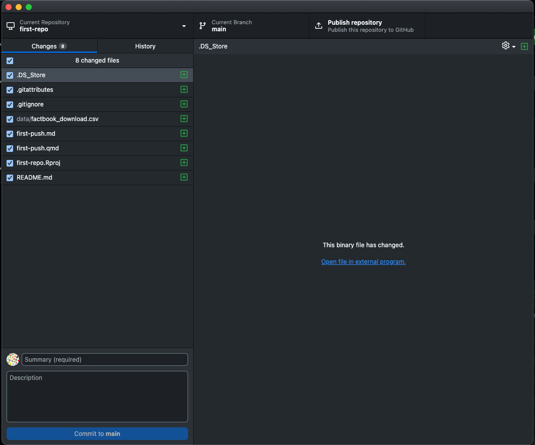Now we can see in GitHub desktop all of the files that are going to be sent to our repository on the lefthand side of the screen.