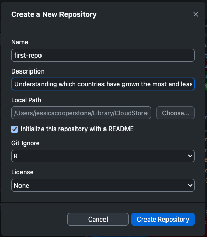 - select if you want a git ignore (we do, set the type as R, and we will talk about it more next week)