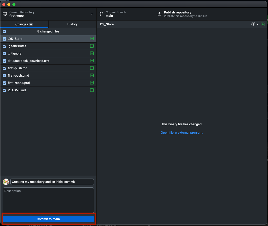 Now we need to send our repository to GitHub. Since we are doing this for the first time, we see a button that says Publish repository. In the future, this button will say Push to origin.