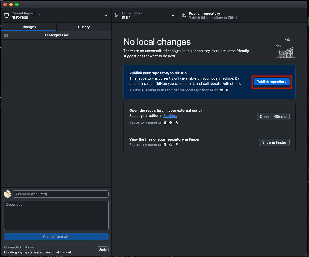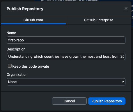 Now, we can publish our repo on GitHub. This will create the repo on GitHub, and it will contain all of our content in it.