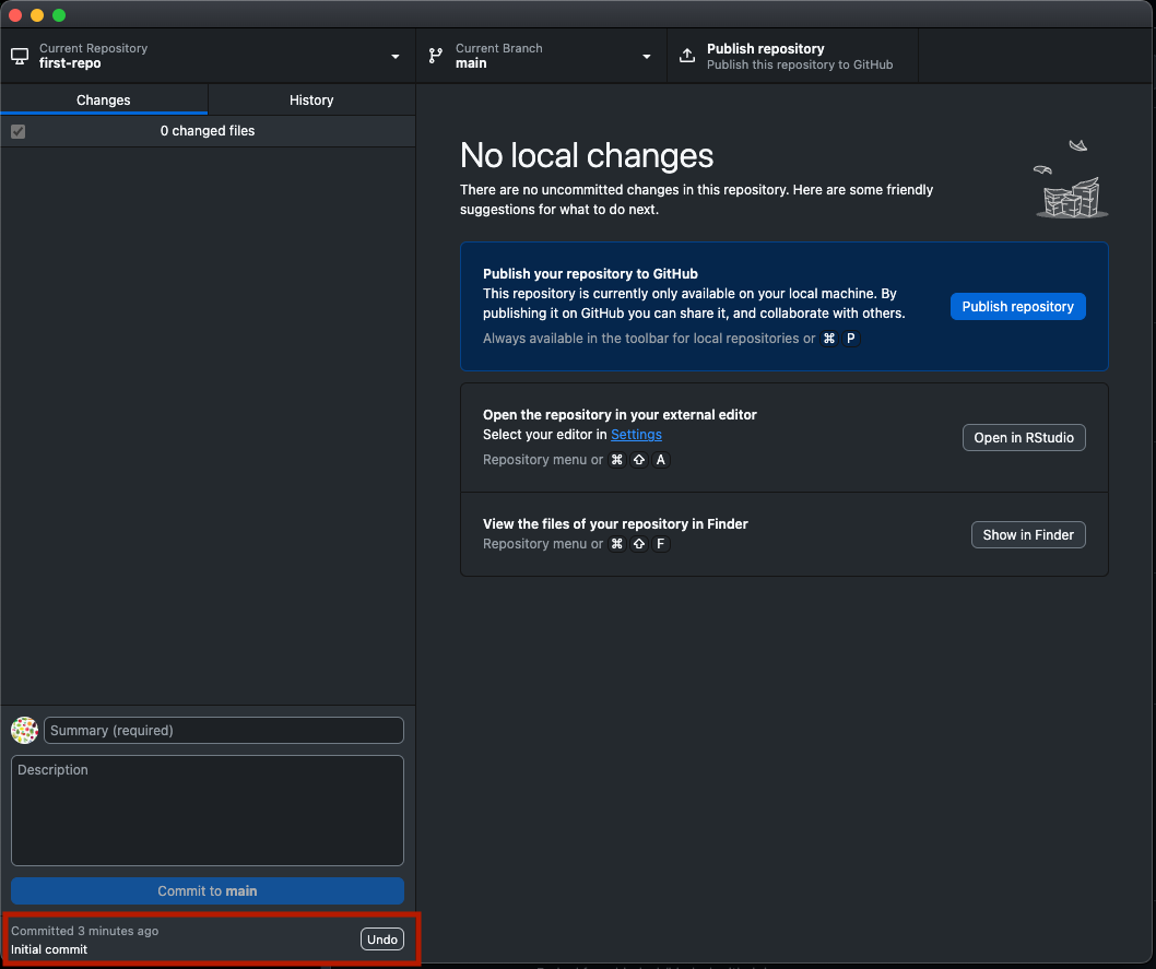 What we can see that GitHub desktop has done for us, since we are setting our repo up for the first time, is automatically made an Initial Commit (see bottom left). We are going to click Undo next to this so we can practice doing this ourselves. You wonât have to do this step in the future.