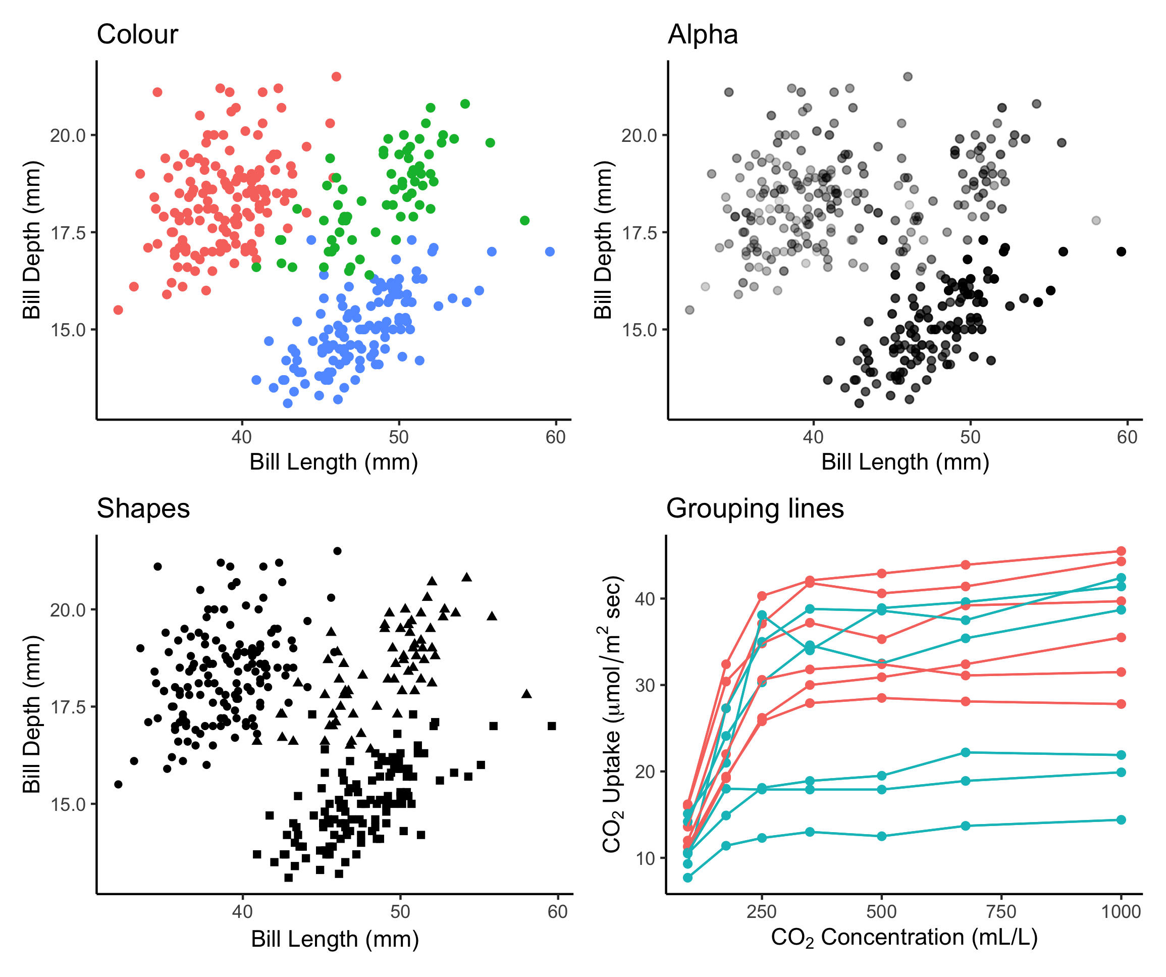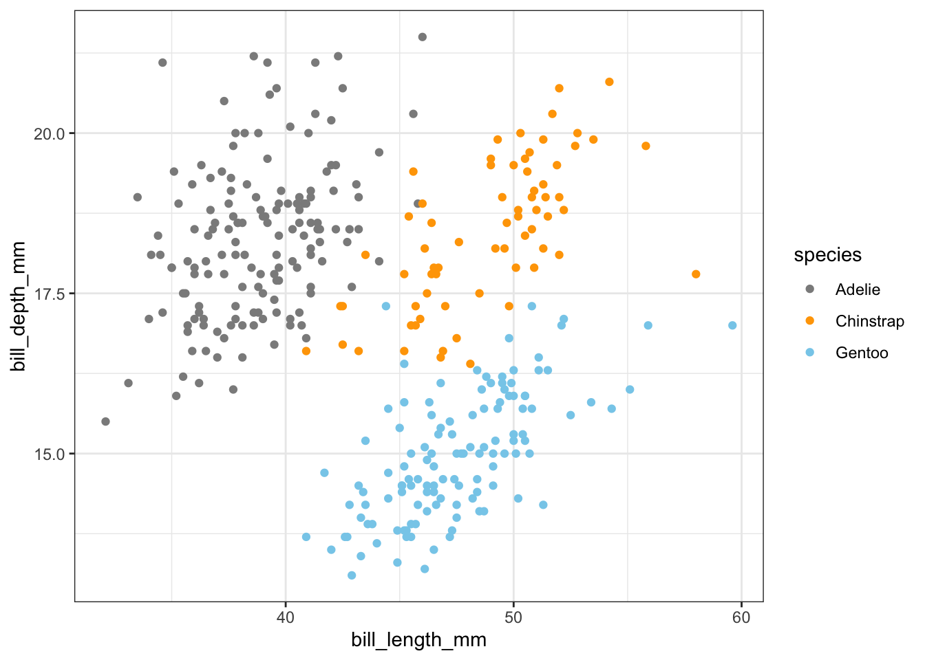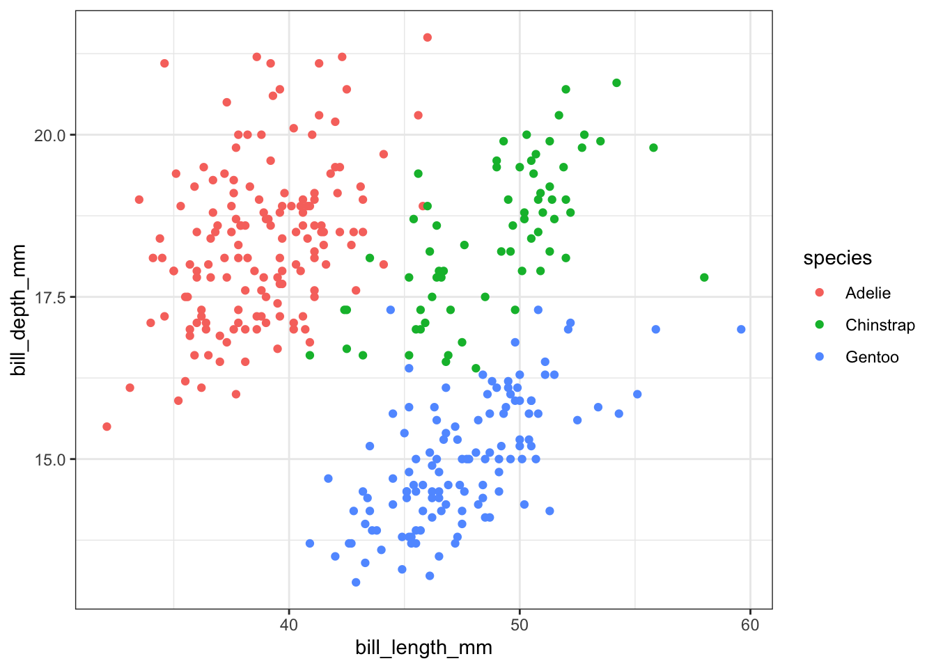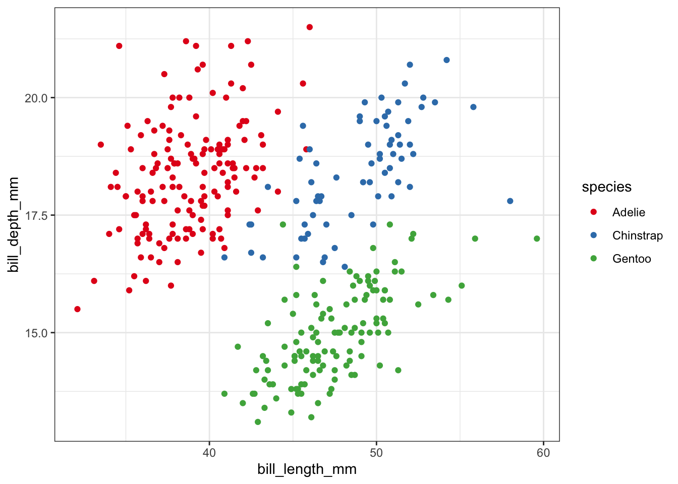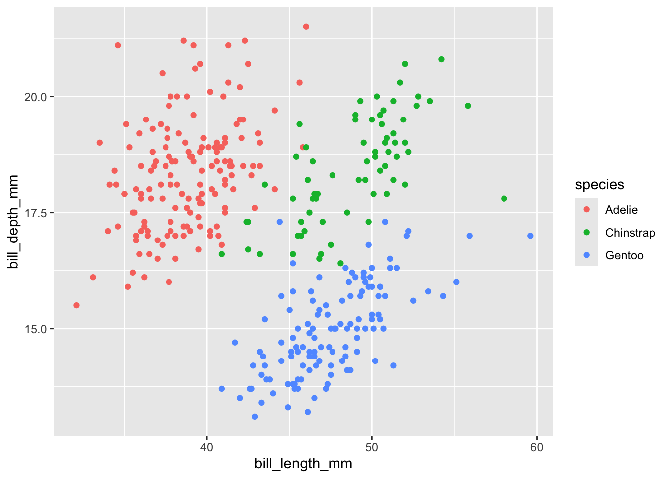 Last week we added a third aesthetic to our graph, color. Our current plot mapped bill_length_mm to the x aesthetic, and bill_depth_mm to the y aesthetic — , we then added a mapping of species to the color aesthetic: