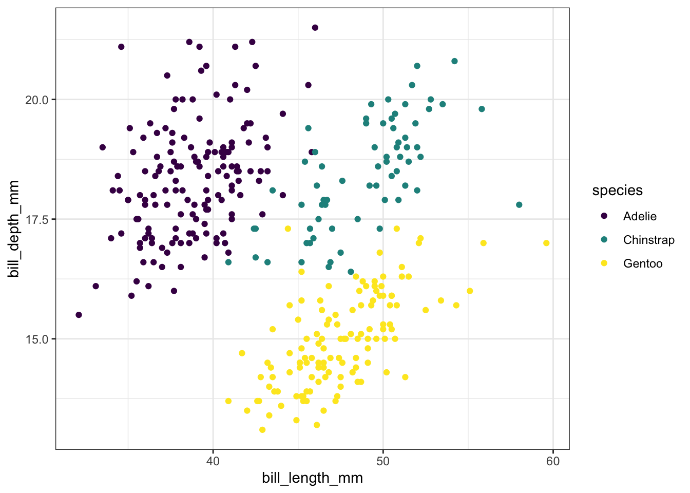 scale_color_viridis() to color data points, we need to specify whether our variable is continuous [using scale_color_viridis_c()] or discrete [using scale_color_viridis_d()]. In this case, the variable species is discrete.