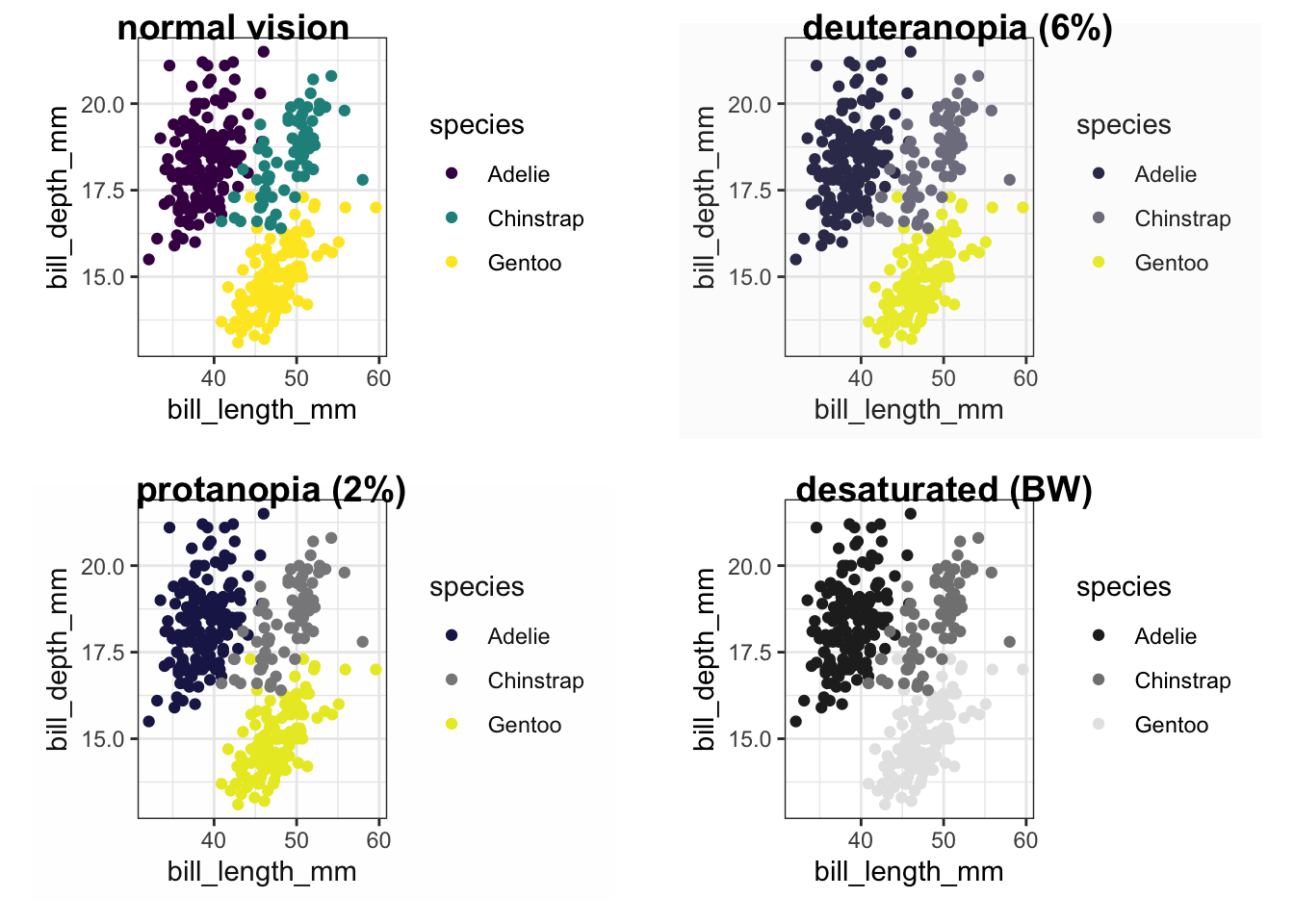 Our current color palette is not accessible, as can be observed. However, by using viridis palettes, we can ensure that our plots consistently convey the same information, regardless of the audience.