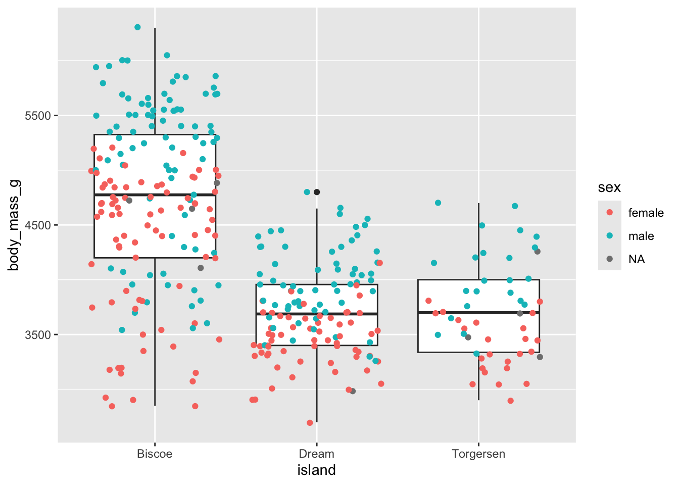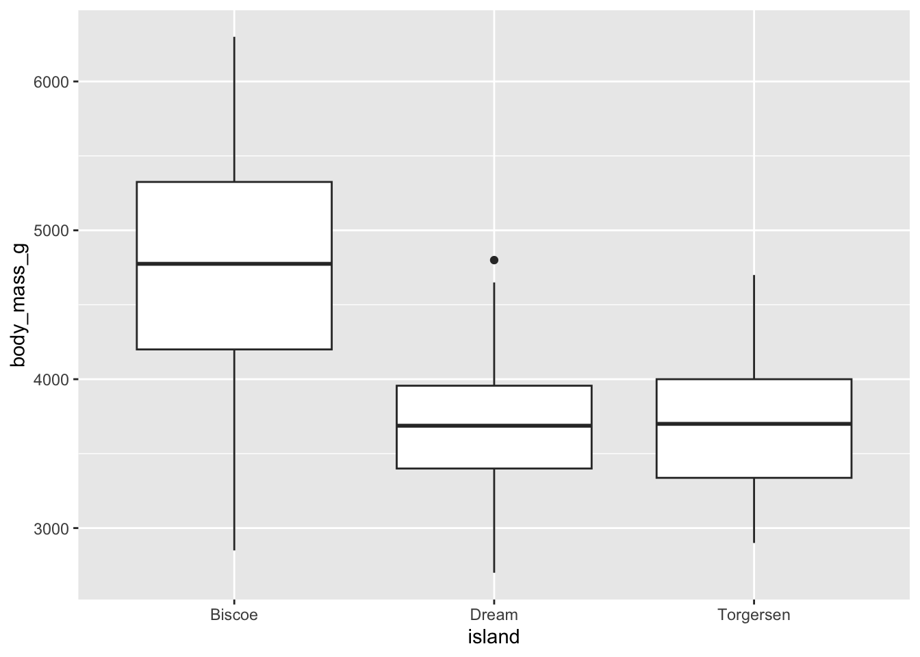 What if we want to see what the body mass of penguins looks like on different islands? We can do that using a variety of different geoms.