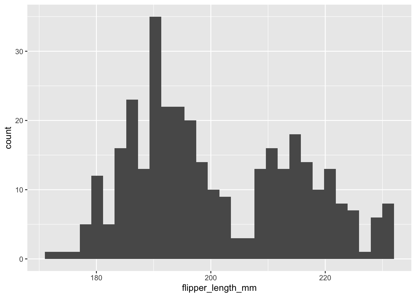 We are going to try looking at some new geoms. Create a plot that shows you the distribution of value for flipper length across all the penguins.