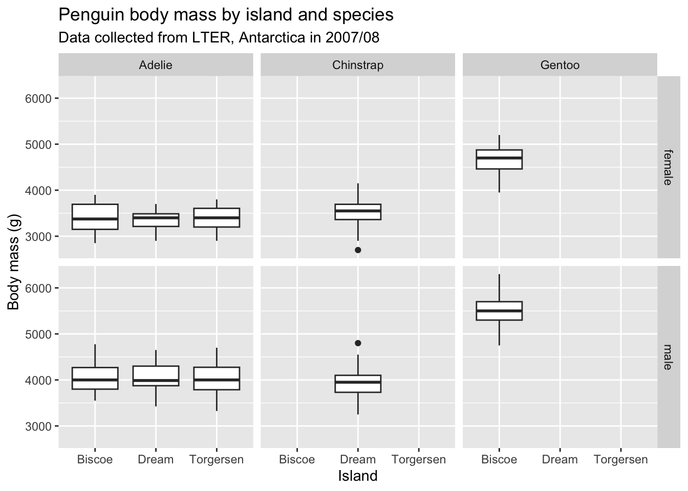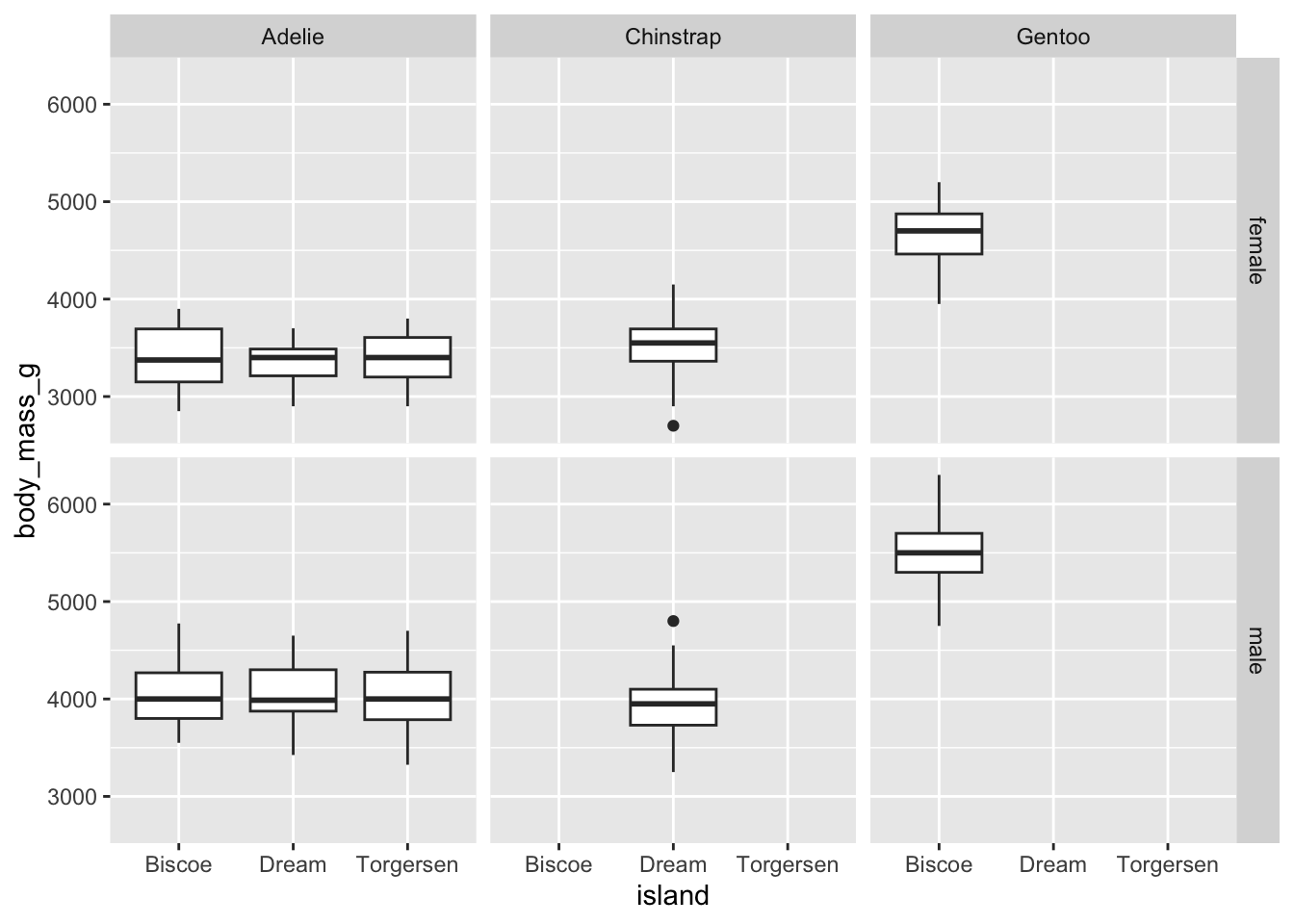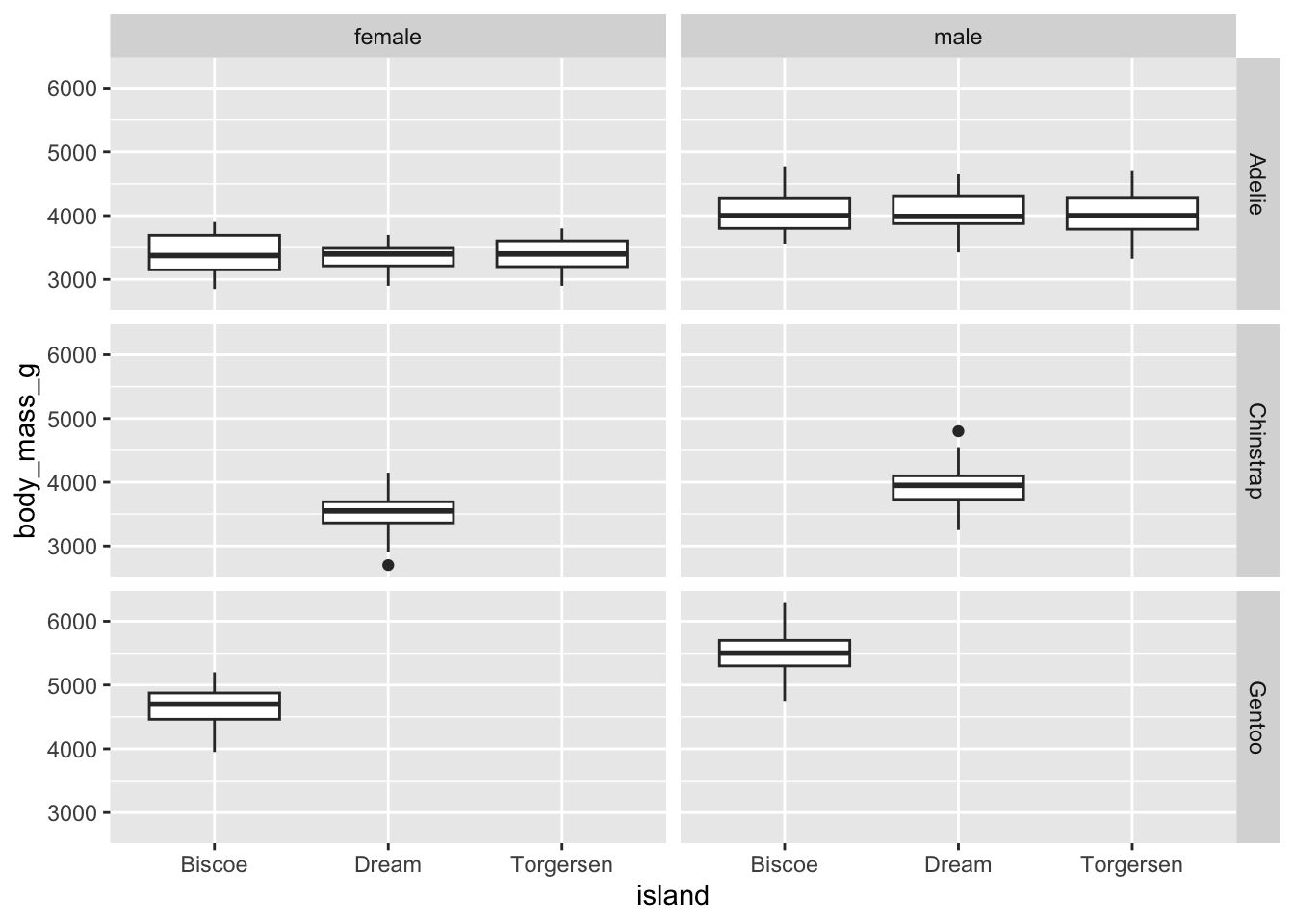 What if we want to see the distribution of body mass across penguins, by both islands and sex? Facets can help with this.
