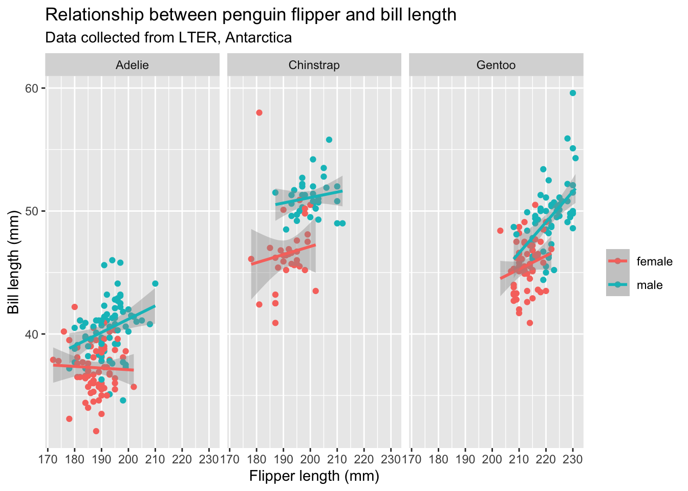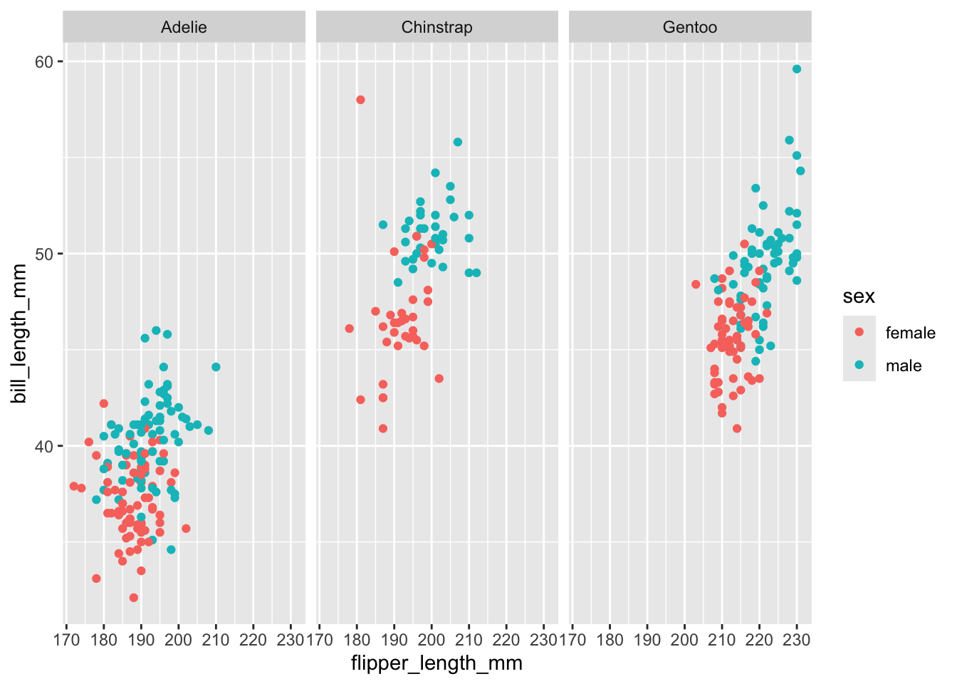 Try using the variables flipper_length, bill_length_mm, species and sex. Try faceting by species and coloring by sex. You can drop missing values with the function drop_na().