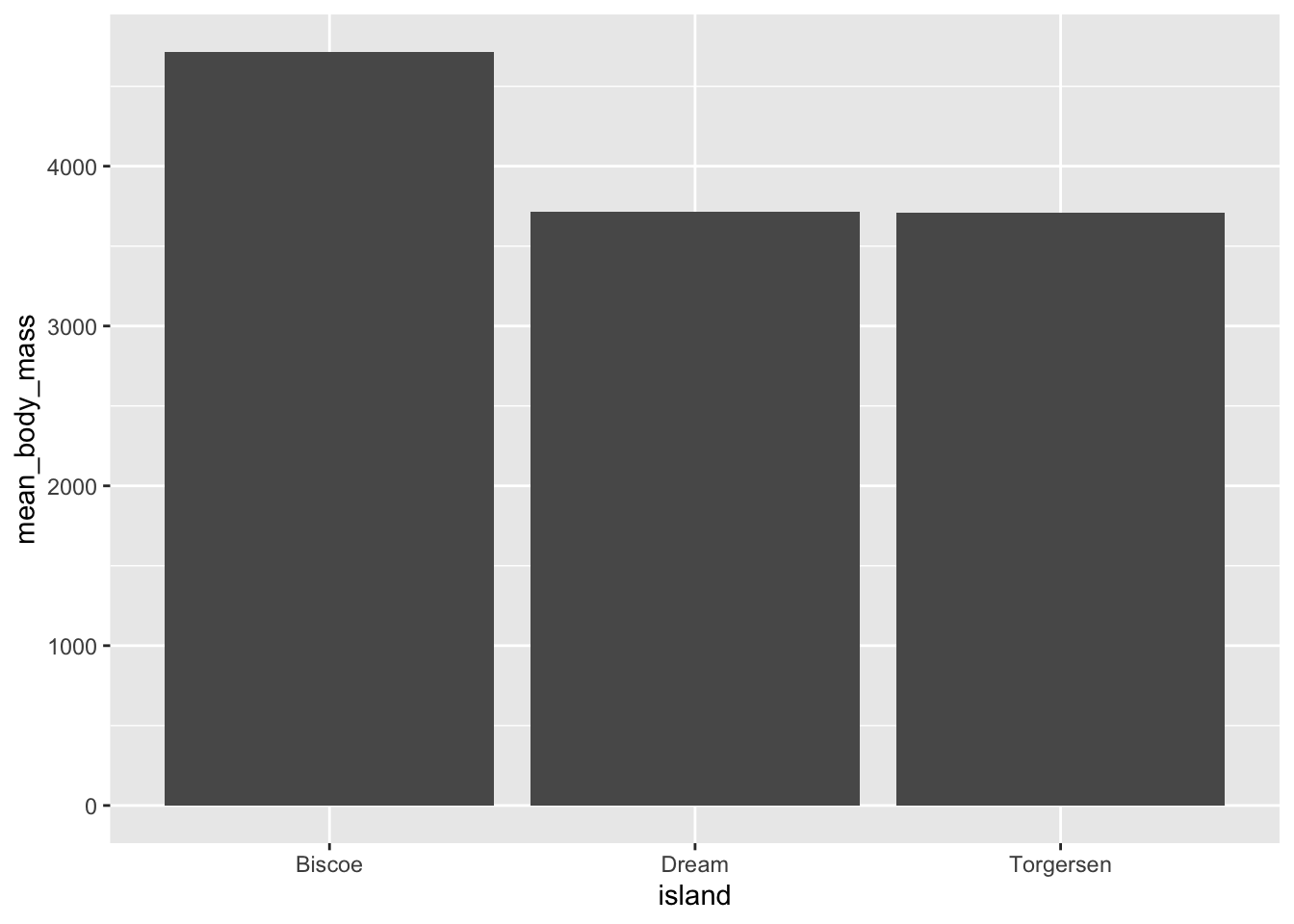Now we can see what the average mass should be for each island. We can take that same code and pipe that into ggplot() to use that as the data to plot.
